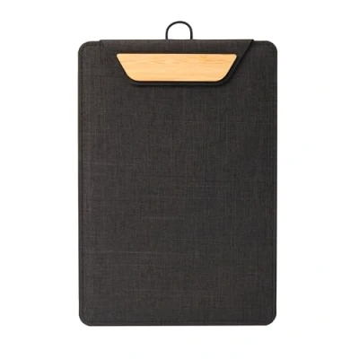 Designed for use e.g. in catering establishments for presenting menus that change frequently, this high-quality clipboard is also ideal for doctors' surgeries or clinics, or as a stand-up display for countertops in a wide range of establishments such as beauty salons, car showrooms, etc. Menu clipboard made of recycled polyethylene (RPET), bamboo, dark grey/beige, with the dimensions 16,50 x 23,50 x 1 cm, for the A5 format. A concealed magnetic clip holds up to 20 sheets; With additional hook at the top for hanging; Practical stand-up feature: can be used standing at an angle or lying flat on the table Durable material (without softening agent), resistant to scuffing, scratches and general wear and tear Stackable and space-saving