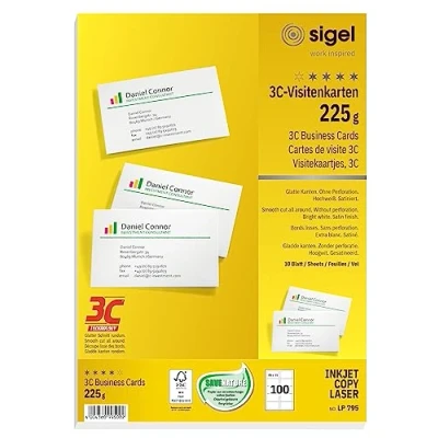 SIGEL LP795, 85x55 mm (A4), Business Cards, 3C, smooth cut all around, 225 gsm, printable, bright White, 100 Piecesequal to10 sheets