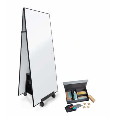 Meet up: These sets of high-quality modern boards are easy to transport, making spontaneous and simple meetings or workshops possible – even without a fixed meeting room 2 mobile Meet up whiteboards 90x180 cm with coated metal surface and high-quality black aluminum frame (MU021), for writing with non-permanent markers, dry and wet erasable, static and magnetic adhesion, 1 Meet up stand with storage compartment and tray (MU055), 2 handles, plus 1 free accessory toolbox (BA311) Whiteboards very easy to transport (only 9.5 kg), therefore for spontaneous meetings or workshops, even without a fixed meeting room Multifunctional stand: can be used with one board inserted in the central slot or with two boards in tent position, and also as storage space for accessories; also available separately: stand MU055 Free starter kit (BA311) including: BA010 whiteboard marker, BA211 square wooden magnets, BA120 wooden whiteboard eraser with replacement pad, BA110 magnetic cleaning cloth, BA140 cleaning spray; essential for any meeting, seminar or workshop