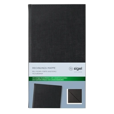 Timeless, high-quality bill folder especially for use in catering establishments Bill folder made of polyurethane (PU), black, with the dimensions 13 x 23 x 1 cm Holds bills, receipts, cash and credit cards Two slanted insert pockets on the inside Hard-wearing cover with classy linen structure, easy to clean; Ideal addition to the SIGEL menu folders & beverage folders and the SIGEL clipboards