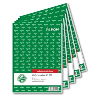 SIGEL SD011 Delivery Notes A5, 2 x 40 Sheets, Self Copying, Pack of 5, Note Pad, with Receipt, Micro Perforated, Made from Sustainable Paper