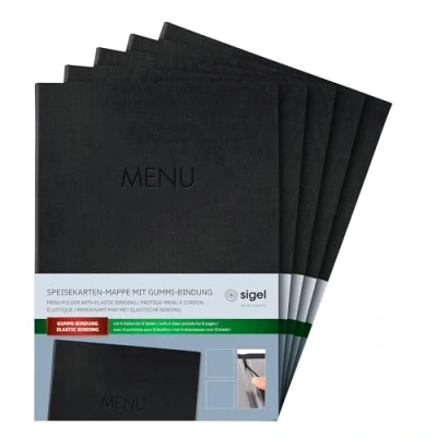 High-quality menu folder with a timeless design from the SIGEL range, ideal for daily use in food outlets of all kinds Menu folder with rubber binding, black, for the 210 x 297 mm format, high-quality cover made of polyurethane (PU), polypropylene (PP) With international blind embossing: "Menu" Simply slide in the information and exchange as required Hard-wearing cover with classy linen structure, easy to clean; Durable PU material (without softening agent), resistant to scuffing, scratches and general wear and tear