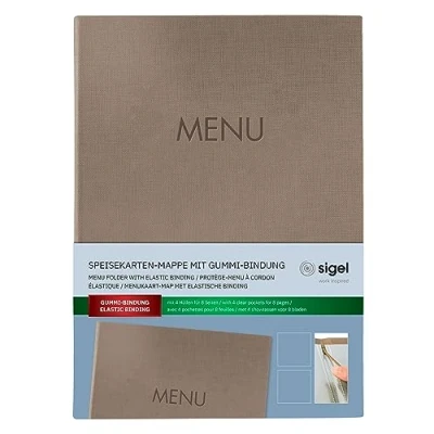 SIGEL SM210 Menu folder with elastic cord, 2 transparent pockets for 8 DIN A4 sheets, embossing Menu, dark Beige