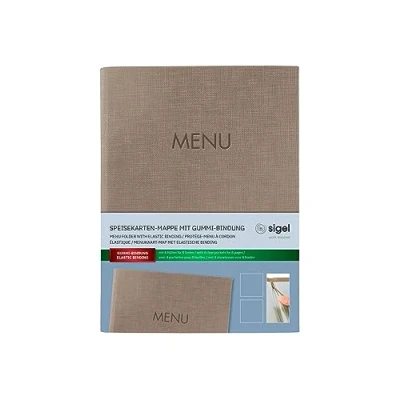 SIGEL SM211 Menu folder with elastic cord,with 2 transparent pockets for 8 sheets DIN A5, embossing Menu, dark Beige