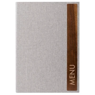 High-quality menu folder with a timeless design from the SIGEL range, ideal for daily use in food outlets of all kinds. Menu folder with rubber binding, light grey/brown, for the 210 x 297 mm format, high-quality cover made of recycled polyethylene (RPET), walnut, polypropylene (PP). Water-repellent finish allows liquid to run off. Modern mix of materials: RPET combined with walnut wood, plus international wording; Simply slide in the information and exchange as required; Hard-wearing cover with classy linen structure, easy to clean Durable material (without softening agent), resistant to scuffing, scratches and general wear and tear Incl. 2 double transparent pockets for a total of 8 pages (additional pockets available to purchase separately)