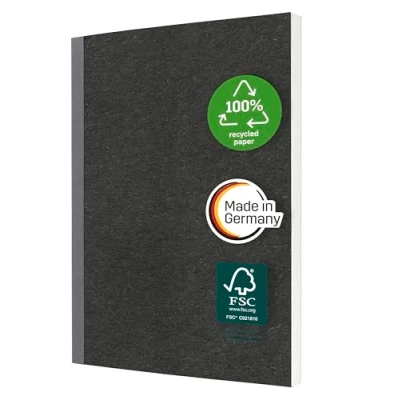 Classic notebook with a natural yet contemporary look. Notebook with a soft cover in black/anthracite, A5 (14,80 x 21 x 1,20 cm) format, lined, with 200 pages. Cover made of textured cardboard with a special feel; High-quality, coloured taped cloth binding, cover opens 180° Smooth paper (FSC-certified, 80 gsm), all pages microperforated Made in Germany