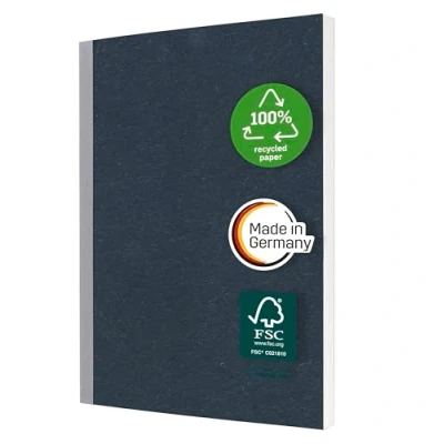 Classic notebook with a natural yet contemporary look. Notebook with a soft cover in dark blue/light grey, A5 (14,80 x 21 x 1,20 cm) format, lined, with 200 pages. Cover made of textured cardboard with a special feel; High-quality, coloured taped cloth binding, cover opens 180° Smooth paper (FSC-certified, 80 gsm), all pages microperforated Made in Germany