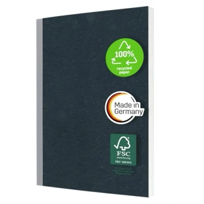 Classic notebook with a natural yet contemporary look. Notebook with a soft cover in dark blue/light grey, A5 (14,80 x 21 x 1,20 cm) format, blank, with 200 pages. Cover made of textured cardboard with a special feel; High-quality, coloured taped cloth binding, cover opens 180° Smooth paper (FSC-certified, 80 gsm), all pages microperforated Made in Germany