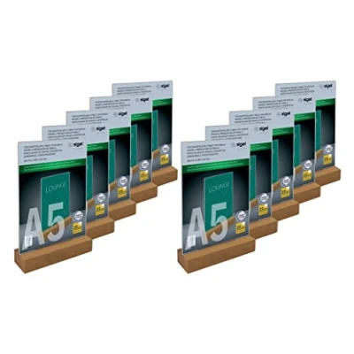 10 elegant and high-end vertical exhibitors with oak base and transparent acrylic top - moveable and versatile T-display with dimensions of 15 x 24.5 x 4.6 cm | Presentation on both sides for DIN A5 format (14.8 x 21 cm) and the transparent acryylic has a width of 1.5 mm PERFECT GRIP: the acrylic plate is securely placed in the wooden base thanks to the innovative S-shaped slot in the center of the oak base HIGH QUALITY: Oak wood oiled with organic oil and FSC certified | High quality acrylic, scratch resistant and transparent with 25 years guarantee of UV resistance (no Yellowing) - more information available below: "Technical specifications" VERSATILE: removable base to change and to perfectly visualize your price lists, menus, Boards, photos and other documents