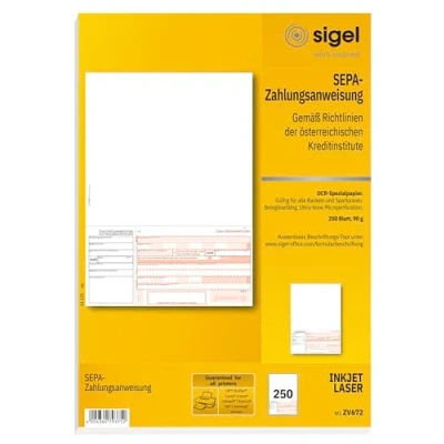 SIGEL ZV672 SEPA Transfers, Payment Instructions Austria, A4, 250 Sheets, Includes Free Download Labelling Assistant