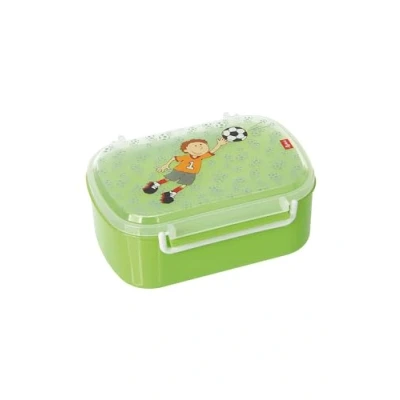 Practical lunch box for boys with colourful football goalkeeper decoration. Ideal for school, nursery and family trips Can be securely closed thanks to 2 sturdy swing fasteners on the left and right, practical separation of bread and fruit/vegetables thanks to the removable raw food bowl High-quality and production, use of food-safe materials, no plasticisers (Bisphenol A ), odourless Care instructions: Dishwasher safe tin and insert, hand wash lid Box contents: 1 Sigikid lunch box with separate bowl, Kily Keeper, material: 100% polypropylene. Recommended age: 3 to 8 years. Colour: Green. Size: 19.4 x 15.2 x 8 cm. No.: 24781 Made of polypropylene (BPA free) 2-8 years age recommendation Please rinse the motif lid by hand. Box and small dishes may be cleaned in the dishwasher. Verified according to LFGB
