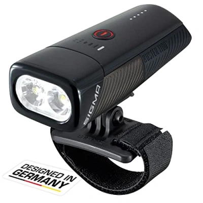 Performance: with up to 1100 lumens and a beam range of 165 metres, the battery-powered BUSTER 1100 with six preset light modes ensures optimal illumination of the paths. Lighting duration: in high mode, the BUSTER illuminates even the darkest corners for up to 2 hours. The flashing Night Flashing and Day Flashing modes ensure good visibility for up to 50 hours Technology: the five-stage battery indicator shows precisely how much battery is still available. Thanks to the silicone holder, the bike light can be attached to the handlebars without tools and easily removed with the "Quick Release". Visibility: thanks to the specially developed Sigma converging lens, the light is distributed evenly and ensures particularly good illumination. The Light Guide on the side of the bike light supports lateral visibility. Scope of delivery: the BUSTER 1100 HL is supplied with a universal helmet mount that attaches the light securely to the helmet, ensuring a secure fit.