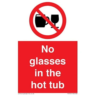 P503 : Do not drink alcohol This sign is made from vinyl / sticker Air Release vinyl makes it easy to stick to flat, clean surfaces without bubbles. Not for rough, plastic or dusty surfaces. A6 portrait Sign Text: No glasses in the hot tub