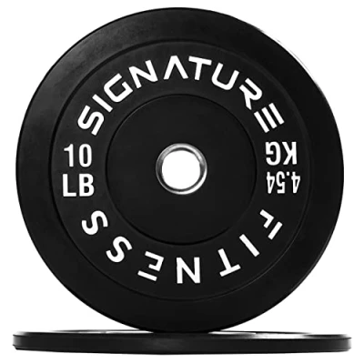 UNMATCHED QUALITY FOR THE BEST PRICES- We invest in quality products that will last you a long, long time, so you don't waste your hard earned money. Compared to similar products on the market, we believe we offer our bumper plates at the best prices for the highest quality 100% VIRGIN RUBBER - LOW ODOR AND BOUNCE - Signature Fitness Bumper Plates contain NO recycled rubber. This means low to no odor, guaranteed durability, and low "dead" bounce for safety. PROTECT YOUR EQUIPMENT AND FLOORING - Using bumper plates allows you to protect your barbell and your floor from damage. Why risk it? Buy a pair of SF bumper plates today. SOLD IN PAIRS - Sold in pairs: 10lb, 15lb, 25lb, 35lb, 45lb and 5lb plates. SAVE MONEY - Signature Fitness Black Bumper Blates are the most economical option for the highest quality.