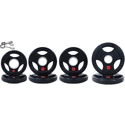 45-Pound Set: 2x 2.5LB, 4x 5LB, 2x 10LB, 1 pair of clips Made of solid cast iron with a 2-inch center hole fits any Olympic bar with diameter 2” or less; Can be used with 2” dumbbell bars too All plates features a durable, black baked enamel finish to prevent the plates from rust and corrosion without any unpleasant odor Labeled in both LB and KG for easy recognition Weight plates can be used to perform muscle strengthening exercises and endurance training, or to increase flexibility and balance