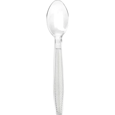 Amazon Marketplace100 PIECES - Includes 100x plastic re-usable dessert spoons. PREMIUM HEAVYWEIGHT PLASTIC - Enjoy any food, from soup to steak, using our sturdy & durable plastic forks, knives and spoons. CRYSTAL CLEAR WITH HERRINGBONE DESIGN - Simple but elegant plastic tableware, suitable for a birthday party, cafes, hospitals and much more. HIGH QUALITY - Every cutlery piece we manufacture passes rigorous quality testing, which is partly why our products are so popular with business customers. RECYCLABLE AND WASHABLE - The dinnerware is re-usable too. Completely free of harmful toxins and coatings, so you can wash and re-use the cutlery again and again., Manufacturer: Signature Packaging