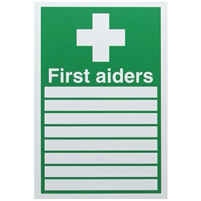 The sign informs staff of the names of the first aiders on site in case of an accident or emergency The 300mm x 200mm sign includes space for names, contact numbers and locations of first aiders The tough PVC sign can be affixed easily to walls, doors and any other surfaces Material: Polyvinyl Chloride