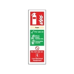 Safety sign for foam fire extinguishers. Universal symbols and colour scheme. Instantly recognisable to users. Professional and informative. Details safe applications for foam fire extinguishers. Self-adhesive vinyl. Size: 300mm x 100mm.