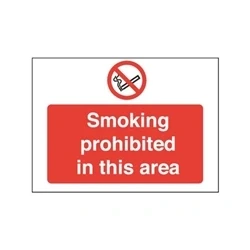 Sign warning of areas where smoking is prohibited. Universal symbol for No Smoking. Instantly recognisable to users. Colour: Red and White. Informs users of the law. Size: 450x600mm. Rigid PVC. Reads 'Smoking Prohibited in This Area'.