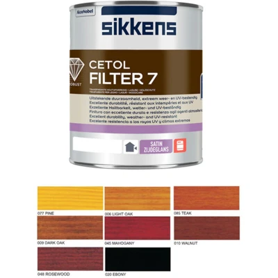 General description A highly durable, medium build, solvent-borne woodstain that provides a highly translucent, satin finish and offers outstanding protection from the damaging effects of sunlight. Cetol Filter 7 is designed for use on exterior softwood and hardwood joinery, making it suitable for windows and doors. It can be applied as a maintenance coat for existing woodstain systems or over a base stain of Cetol HLS on new or bare timbers. Technical specifications Colour: Mahogany Size: 1 litre Usage Exterior and interior softwood and hardwood Can be overcoated with woodstains, paints, and colourless finishes Quick drying with good response to sanding Good adhesion to bare wood Other information Not suitable for decking or areas subjected to high levels of abrasion Advanced UV light absorbers provide superior protection from sunlight