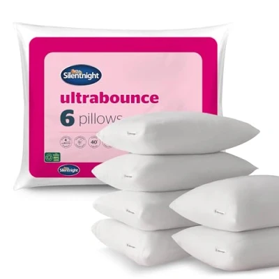 ULTRA BOUNCY COMFORT: Filled with bouncy fibres that spring back to shape for ultimate comfort and support whilst you sleep SOFT/MEDIUM SUPPORT: Use one pillow for soft comfort or two pillows for firmer support 6 PACK: Pack contains 6 Silentnight Ultrabounce Pillows HYPOALLERGENIC: Kind to skin and does not include any contents likely to cause allergies MACHINE WASHABLE: Fully machine washable for bouncy freshness time and time again MADE IN THE UK: Proudly made with care in the UK QUALITY GUARANTEE: 2 year manufacturer’s guarantee