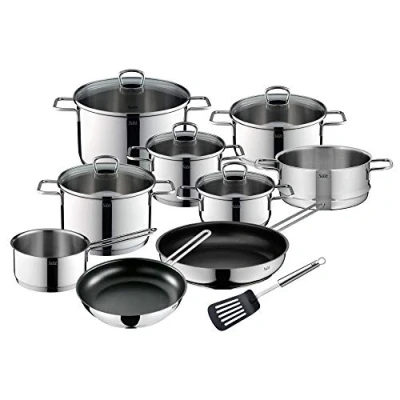 Contents: 3x casserole pot with lid 16 cm (V 1.9 l), 20 cm (V 3.3 l), 24 cm (V 5.7 l), 2x stewing pan with lid 16 cm (V 1.4 l), 20 cm (V 2.5 l), 1x saucepan without lid 16 cm (V 1.4 l), 1.4 l), 1x steamer insert 20 l cm, 2 x frying pans. 24 cm, 28 cm. Item number: 2109304623 Material: 18/10 rustproof stainless steel, dishwasher-safe, easy-care, oven-safe, neutral in taste and acid-resistant. Heat-resistant up to 250 °C (or 180 °C with lid) The pots without scale can be used on all common types of cookers: induction, gas stove, electric hob, glass ceramic hob. Thanks to the optimal heat distribution, nothing burns The handles of the stainless steel saucepan set provide a secure grip and do not get hot during cooking. The glass lid allows you to observe the cooking process The base construction (SiliTherm) ensures even and long heat retention. This saves energy and time during cooking