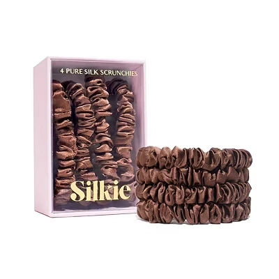 100% MULBERRY SILK - Formulated with the highest quality silk, Silkie scrunchies glide through the hair, protecting it from split ends and causing no damage. Tie your hair in a bun at night with a Silkie scrunchie to prevent friction, tangles and damage overnight. The smooth surface of Silkie scrunchies prevent hair being caught and snagged, unlike cheaper elastic hair ties NO DAMAGE - Eliminate snapping - traditional hair ties pull and tug on delicate hair strands, which leads to damage and breakage. The ruched effect and high quality silk formulation of our scrunchies prevents this, with the added bonus of putting a stop to kinks or hair tie creases in the hair. Silk also helps to preserve moisture levels in the hair, preventing frizz. Making the simple switch to using Silkie scrunchies can make the world of difference to your hair MULTI PURPOSE - Stylish and functional, each set of Silkie skinny scrunchies comes with 4 different complimentary tones - take your pick from our Chocolate or Nudes collections. Neutral, practical colours mean they can be worn in the daytime, evening wear for a chic look, or even during exercise and at the gym. Silkie scrunchies are suitable for all hair types! STYLISH - Better hair days are coming! Silkie scrunchies look elegant with any type of hairstyle - be it ponytail, chignon, top knot or even half up and half down looks. Our skinny scrunchies are a slimmed down version of our best selling oversized set, which help to keep bad hair days at bay COMPLIMENTARY STORAGE POUCH - Each scrunchie set comes with a matching storage pouch, ideal for preventing damage to the scrunchies during travel or when not in use. Silkie scrunchies are easy to care for, washed by hand
