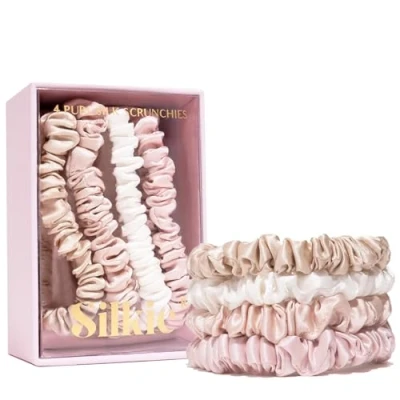 SILKIE x4 Set 100% Pure Mulberry Silk Nude Pink Neutral Skinny Scrunchies Travel Pouch Everyday Hair Ties Elastics Care Ponytail Holder No Damage