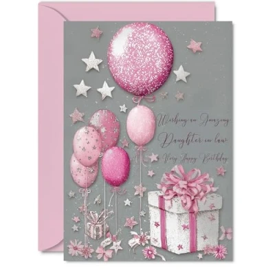 Silver Daughter in Law Birthday Card and Pink Presents Happy for from Father Dad Mother Mum, A5 Bright Joyful Bday Greeting Cards