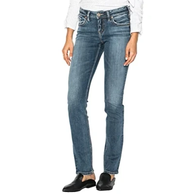 Silver Jeans Co. Women's Suki Curvy Fit Mid Rise Straight Leg Jeans, Medium Sandblast, 30W x 32L