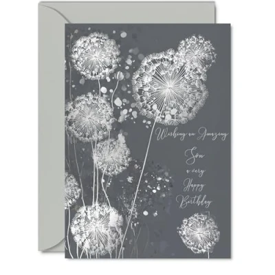 Silver Son Birthday Card Shimmering Dandelions Happy for from Dad Mum, 5x7 Inch Elegant and Modern Bday Greeting Cards
