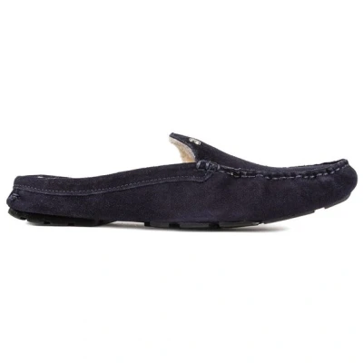 Men's Navy-blue Silver Street Walbrook Moccasin Style Slippers With Soft Suede Uppers Featuring Branded Metal Stud On Vamp, And Cream Soft Faux Fur Lining. These Open Back Mules Are Finished With A Woven Branded Footbed Tab, And A Flexible Black Rubber Sole.