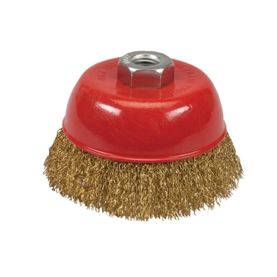 High tensile crimped brassed steel wire, 0.3mm diameter, for rust and paint removal, descaling, deburring and preparation of welding seams. For metal and stone working, cleaning, surface preparation and fabrication tasks. Use with angle grinders. M14 x 2 female thread.