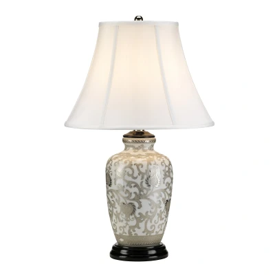 This Chinese porcelain table lamp has a silver floral pattern over a cream crackle glaze. The wooden cap and base add to the look and quality of the fitting. Silver Thistle is also available in a gold finish; called Gold Thistle. The white polycotton empire shade adds a perfect touch to the table lamp, giving it a real traditional and old-fashioned look. Perfect in any classic style living room for adding a soft ambiance.