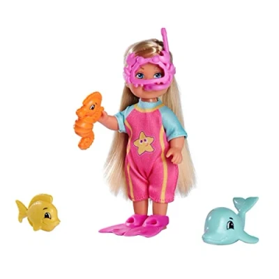 Dressing doll - Evi Love is the little cute sister of Steffi LOVE. Like Steffi, she has great long hair, countless hobbies, loves animals and is perfectly dressed for any occasion. Girls can style and dress their doll in current fashion trends Evi in the diving suit - the little Evi explores the underwater world and goes into the water in her pink diving suit. With the diving goggles in crab shape and the fins, it is well equipped With sea creatures - in addition to Evi, the set also includes three cute sea creatures (dolphin, fish and seahorse) that Evi has discovered while diving Recommended age: the Evi doll is 12 cm tall and suitable for children aged 3 and over Simba - Elephant-sized fun. At the heart of product development is the enthusiasm of children. For boys and girls, small and large. Children should have fun and be encouraged, Manufacturer: Simba