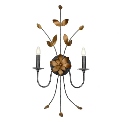 The grey body of this two-arm wall scone is accented by gold sculpted blossom elements, gilded leaves, and candle-like fixtures. Also available in this range; 6lt Chandelier.