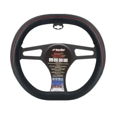 Secure grip: non-slip surface for optimal control and a stable grip in all driving conditions. DURABLE MATERIAL - Made of high quality PU leather, durable and pleasant to the touch. Sporty design: Contrasting red stitching gives a dynamic and elegant look to the interior UNIVERSAL COMPATIBILITY: Suitable for steering wheels with diameter from 37 to 39 cm, easy to install without tools. Driving comfort: Improves the steering wheel feel by reducing slipping and wear on the original steering wheel.
