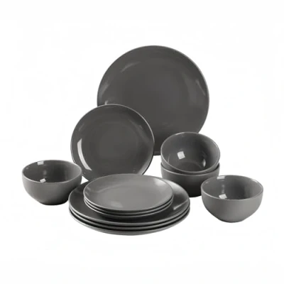 simpa 12PC Grey Glazed Ceramic Stoneware Dinner Set. 4 Plates, Side Plates & Bowls. Dishwasher Microwave Safe.