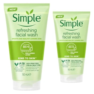 Gentle Daily Cleanser: Formulated specifically for sensitive skin, the Simple Kind to Skin Refreshing Facial Wash provides a soothing cleanse without irritation. Its mild, soap-free formula gently removes dirt, excess oil, and daily impurities, leaving your skin feeling soft, refreshed, and balanced. Perfect for morning and evening routines, this facial wash ensures your skin stays healthy and calm, even with daily use. Hydrating & Soothing Formula: Enriched with Vitamin B5, Vitamin E, and Glycerin, this facial wash nourishes and hydrates while cleansing. It helps restore the skin�s natural moisture balance, leaving it soft, supple, and smooth. Ideal for sensitive and delicate skin, it reduces dryness and tightness often caused by harsh cleansers. Removes Impurities & Makeup Residue: This refreshing facial wash works effectively to remove dirt, oil, and light makeup residue without stripping the skin of essential moisture. It unclogs pores, reduces the risk of breakouts, and leaves the skin feeling purified and rejuvenated. Its gentle, non-comedogenic formula ensures that even delicate and reactive skin types are cleansed without irritation, making it suitable for everyday use and ideal for those with sensitive or allergy-prone skin. Dermatologically Tested & Hypoallergenic: Simple Kind to Skin Refreshing Facial Wash is dermatologically tested and free from artificial perfumes, colours, and harsh chemicals, making it safe for sensitive skin. Its hypoallergenic formulation minimizes the risk of allergic reactions, ensuring a gentle and reliable cleansing experience. Convenient 2 Pack for Daily Use: This value pack contains two 150ml bottles of Simple Kind to Skin Refreshing Facial Wash, ensuring you always have a fresh supply for your daily skincare routine. Ideal for home, travel, or sharing with family members, the pack offers convenience, long-lasting use, and consistent gentle care for sensitive skin.