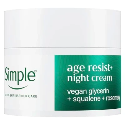 Age Defence: Simple Age Resist+ Night Cream (Regeneration*) is powered by vegan glycerin, biomimetic squalane and rosemary to help fight premature ageing while you sleep Clinically Proven: This nourishing facial moisturiser boosts cellular** hydration overnight, helping skin to feel softer, more supple, and replenished by morning Works with Skin's Own Biology: Our face cream formula works with your skin’s own biology to help enhance its natural hydration and renewal processes for a youthful and radiant complexion Efficacious Textures: A rich, nourishing night cream that absorbs effortlessly, delivering deep** hydration and comfort as you rest Dermatologically Tested: This moisturiser is dermatologically tested on sensitive skin to ensure it’s effective and suitable for all skin types Thoughtfully Formulated: Formulated with skin-friendly ingredients, our Simple face moisturiser is vegan-friendly and free from perfume, colour and harsh chemicals