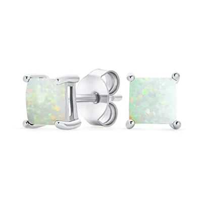 Simple Classic White Opulence Gemstone Created Opal Square Princess Cut Stud Earrings .925 Sterling Silver 5MM October Birthstone