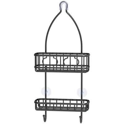 Classic Bathroom Shower Caddy for shampoo, conditioner, body wash, soap, razors, shower sponge, loofahs and bath accessories. One deep basket and One shelf with two hooks. Non-slip grip and two suction cups keep shower caddy in place. Made of sturdy steel construction with rust-resistant Elegant Bronze Finish. Assembly Dimension: 22'' H x 10.2'' W x 4.2'' D;USPTO Patent NO:USD875424S1