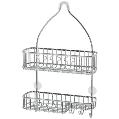 Classic Bathroom Shower Caddy for shampoo, conditioner, body wash, soap, razors, shower sponge, loofahs and bath accessories One deep basket, One shelf and one soap holder with four hooks. Non-slip grip and two suction cups keep shower caddy in place Made of sturdy steel construction with rust-resistant Elegant Chrome Finish Assembly Dimension: 26'' H x 16'' W x 5.5'' D;USPTO Patent NO:USD875424S1, USD875423S1