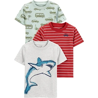 Simple Joys by Carter's Baby Boys' 3 Pack Short Sleeve Tee Shirts T, Light Green Cars/Red Stripes/White Shark, 8 (Pack of 3)