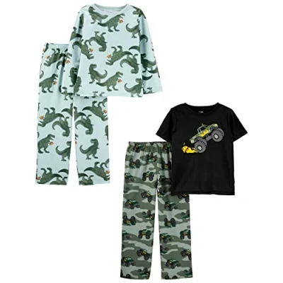 Simple Joys by Carter's Boys' 4 Piece Poly Pajamas Set, Aqua Blue Dinosaur/Black Trucks/Green Camo, 7 Years (Pack of 2)