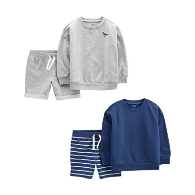 Simple Joys by Carter's Toddler Boys' 4 Piece French Terry Long Sleeved Shirts and Shorts Playwear Set, Pack of 4, Grey/Navy/Dinosaur/Stripes, 2 Years