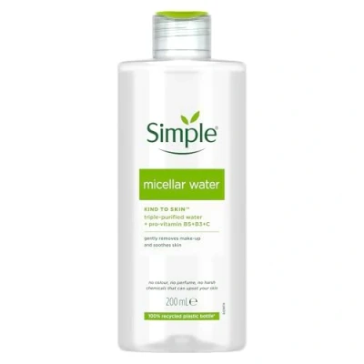 Simple Kind to Skin Micellar Cleansing Water is a skin moisturiser that effectively cleanses, unclogs pores, and removes dirt and impurities while removing makeup, without irritating the skin With no rinsing required, our face cleanser leaves skin feeling fresh and clean, and instantly boosts skin’s hydration by 90% Simple Micellar Water is alcohol-free and contains no artificial perfumes or dyes, no artificial colour and no harsh chemicals that can upset your skin Our effective facial wash is gentle on even the most sensitive skin – it's hypoallergenic, non-comedogenic (meaning it doesn’t clog pores) and it's dermatologically tested and approved This innovative facial cleanser contains micelles, clever cleansing bubbles that are smart enough to gently lift makeup and impurities and unclog pores while hydrating skin Simple Kind to Skin Micellar Cleansing Water is PETA certified cruelty-free and vegan. Globally, Simple does not test on animals