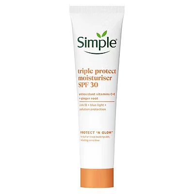 Simple Triple Protect Moisturiser SPF 30 is a lightweight, non-greasy face cream that offers triple protection against UVA/UVB rays, pollution, and blue light while hydrating and brightening skin with vitamins C&E and prebiotics. Suitable for all skin types—including sensitive skin—it’s free from harsh chemicals and perfect as a daily moisturiser or makeup primer.