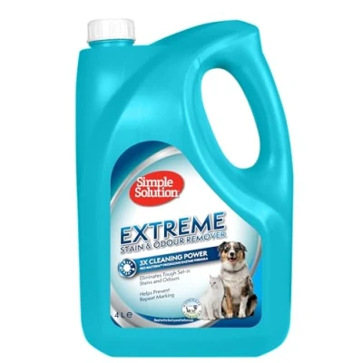 TRIPLE STRENGTH: Simple Solution Extreme is 3x stronger than regular removers for quick elimination of pet messes PRO-BACTERIA FORMULA: Utilises professional enzymes to dissolve stains and odours, deterring pets from re-marking SURFACE SAFE: Effective on urine, faeces and vomit across water-safe surfaces like carpets and upholstery FAMILY-FRIENDLY FORMULA: Protect your loved ones with a solution that’s tough on stains but gentle around children and pets, providing peace of mind alongside cleanliness VERSATILE CLEANING: Can be used in carpet cleaning machines, for large surface area cleaning and as a laundry pre-wash