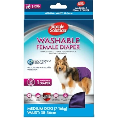PERFECT FIT FOR MEDIUM DOGS: Our medium nappies fit snugly around your fur baby’s waist 38-56cm (7-16kg) for a custom fit. Say goodbye to sizing woes with our easy-to-use chart! SUPERIOR LEAK PROTECTION: Simple Solution nappies are equipped with a super-absorbent microfibre pad and a plastic liner, these wraps prevent any mishaps. The repositionable closure guarantees a snug fit every time UNMATCHED COMFORT: A moisture-wicking liner shields your dog’s skin and coat, while the stretch waistband provides freedom of movement without compromising on dryness VERSATILE USE: Ideal for house training, managing excitable urination, incontinence, or male marking. Travel with your dog without worries! CONVINIENCE: Comes with 1 machine-washable wrap per package, with a separate version available for female dogs